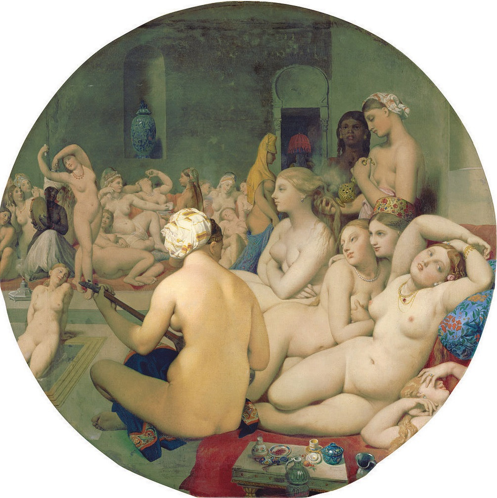 다음 작품은 '터키탕'입니다. 목욕탕의 여인들이 관능적이고 나른한 포즈를 취하고 있네요. 여인들의 포즈나 전체적인 분위기를 보니 그리스 신화의 한 장면을 보는 것 같기도 합니다. 아, 혹시 발견하셨나요? 가운데에 앉아 악기를 연주하고 있는 여인은 방금 감상한 '발팽숑의 목욕하는 여인'과 비슷한 자세를 취하고 있습니다. 머리에 두른 터번도 비슷하고 말이지요. 앵그르는 여성의 뒷모습이 특별히 아름답다고 생각했는지도 모릅니다.