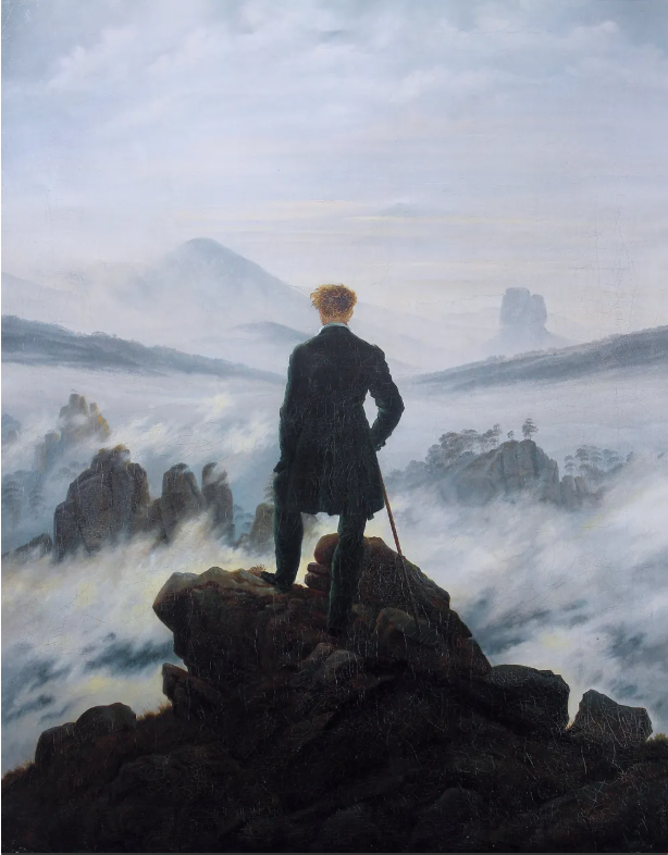 다음 작품은 '안개 바다 위의 방랑자'입니다. 안개가 자욱한 바닷가에 한 사나이가 서 있습니다. 거대한 바다 앞에 선 그는 아마도 말이 없을 것 같습니다. 아마도 형언할 수 없는 경외감을 느끼는 중일 것 같지요. 바닷 바람이 차지만 아무래도 상관없을 것 같습니다. 대자연 앞에서 그간의 걱정, 근심이 모두 씻겨내려가는 것만 같을 테니까요. 세상 염려가 너무 작고 보잘것 없게 느껴지는 중일 테니까요.