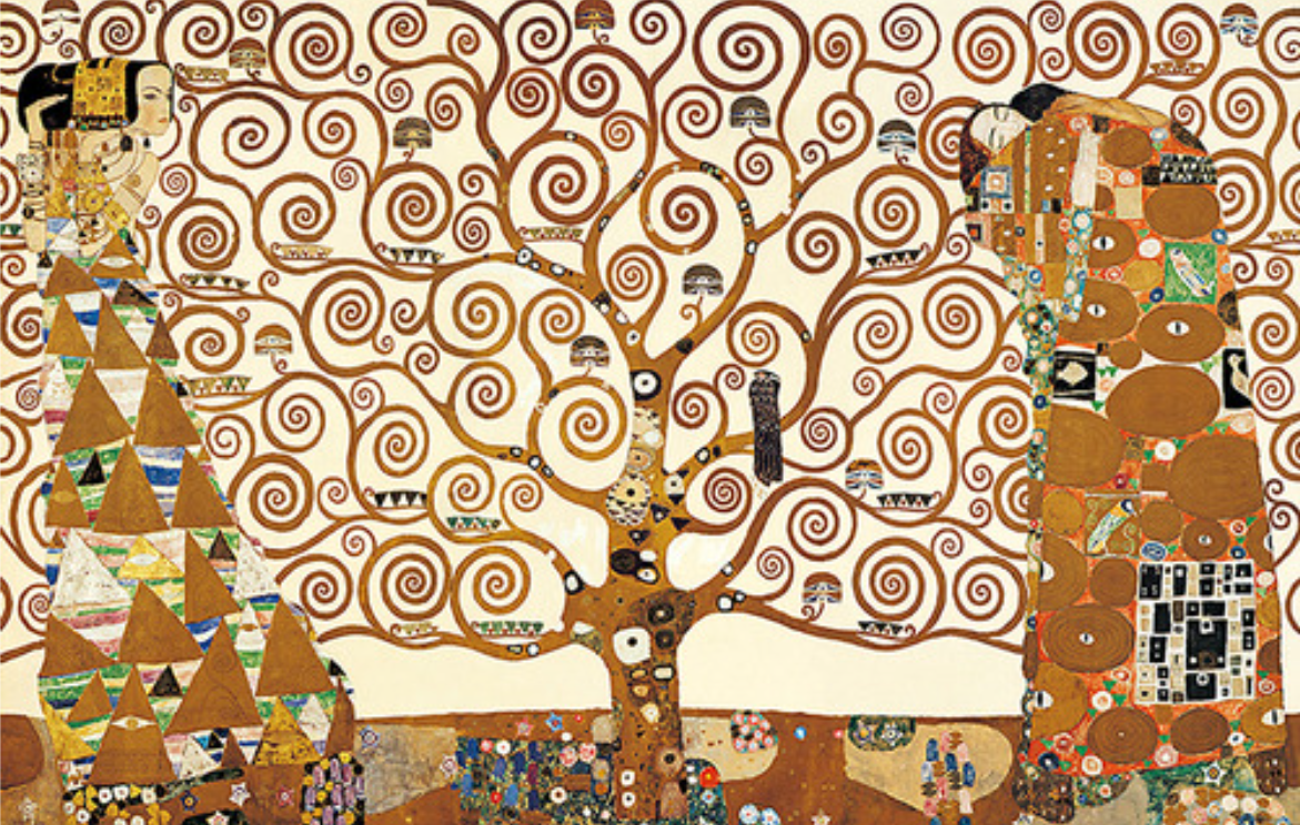 함께 감상하실 세 번째 작품은 '생명의 나무'입니다. 클림트 특유의 곡선과 기하학적 무늬가 특징인 작품입니다. 구불구불 곡선이 마치 아지랑이가 피어오르는 것 같기도 하고, 새 잎이 움트는 것 같기도 합니다. 생명 나무에는 열매가 주렁주렁 달려 있네요. 새도 한 마리 앉아 있고요. 나무 아래쪽은 꽃밭인가 봅니다. 나무의 양옆에는 사람들이 있군요. 왼편에는 삼각형 무늬의 옷을 입은 여성이 서서 먼 곳을 응시하고 있고, 오른편에는 남성과 여성이 뜨거운 포옹을 나누고 있습니다. 사랑을 나누는 커플에게서 생명력이 느껴지네요.