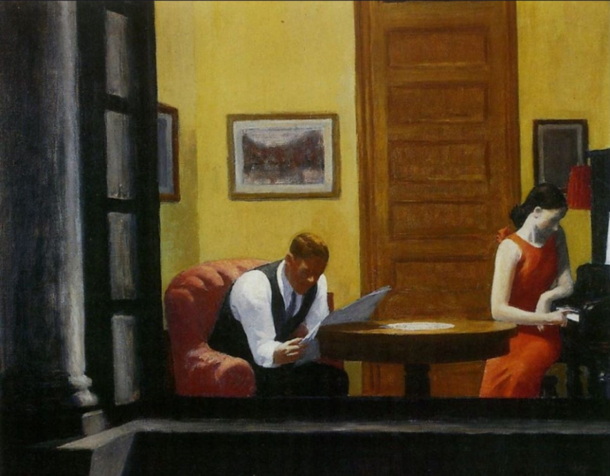 다음 작품의 제목은 'Room in New York'입니다. 이 그림도 창 밖에서 건물 안을 들여다보는 모습의 그림이네요. 호퍼는 내부, 혹은 인간의 내면을 들여다 보는 일을 즐겨 했나 봅니다. 어쩌면 그것이 자신의 내면이었을지도 모르겠군요. 남성은 신문을 펼쳐 들고 있고, 여성은 한 손가락으로 피아노 건반을 누르고 있습니다. 신문 읽기에 열중해 있는 남편에게 무언가 꺼내기 어렵던 이야기를 시작하려는 참일까요? 남녀 사이에 무슨 이야기가 오가게 될는지요? 노란 불빛에 약간의 긴장감이 느껴지는 듯도 하고 말이지요.