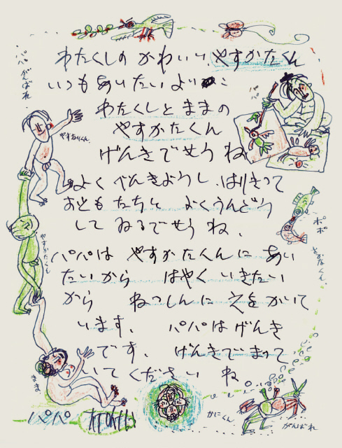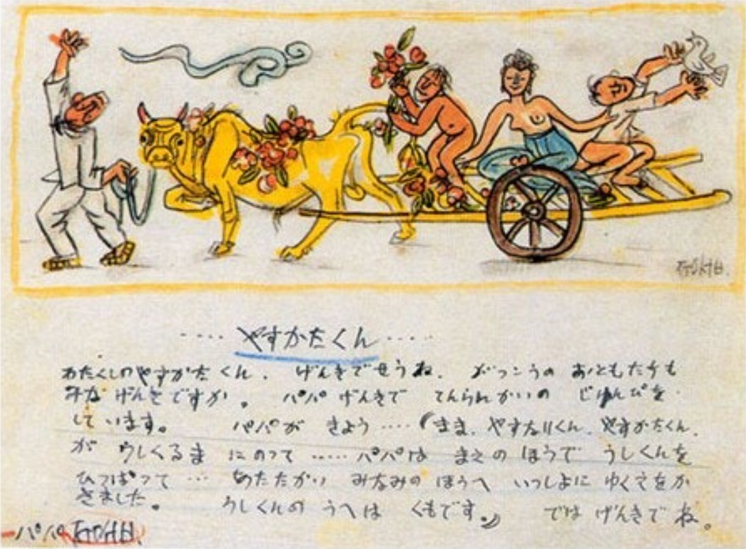 "그림을 그리고 있어요. 아빠가 있는 경성은 너희가 있는 미슈쿠보다 추운 곳입니다. 기차로 몇 시간이나 걸리는 곳에 있던 아빠의 잠바를 오늘 아빠의 친구가 가지고 와주어서 아빠는 매우 기뻐요. 이보다 더 추워도 아빠는 따뜻한 양피 잠바를 입고 그림을 그릴 수 있으니 괜찮습니다."